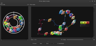 Displays car positions on a track. Specific car can be selected. Both leader car and