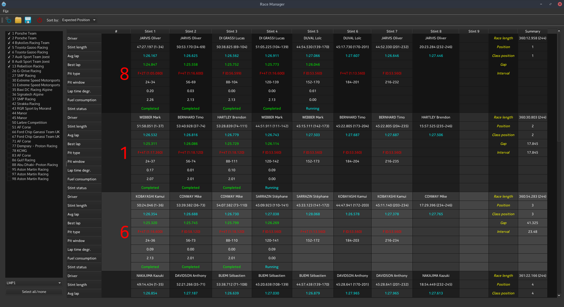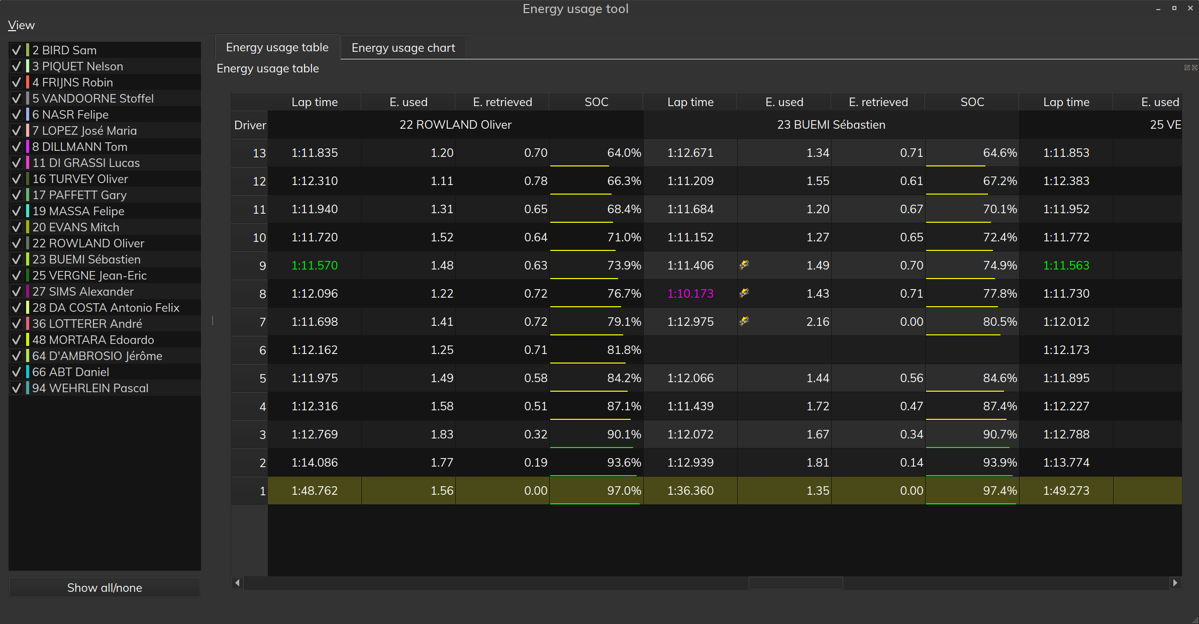 This tool calculates energy used/retrieved by each car lap after lap. It also shows predicted state of charge (SoC) which allows engineers to compare their cars energy consumption with competitors.